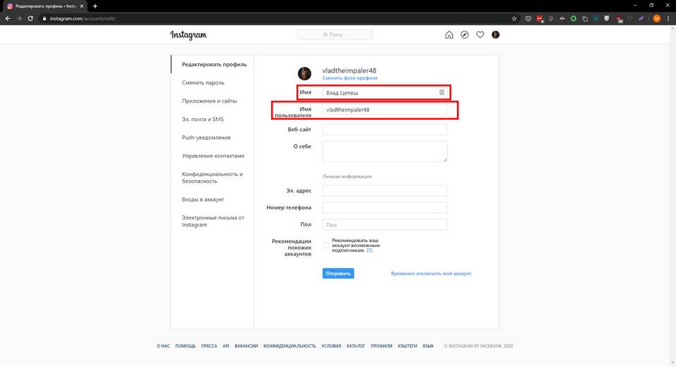- Нажмите "Изменить" рядом с текущим именем