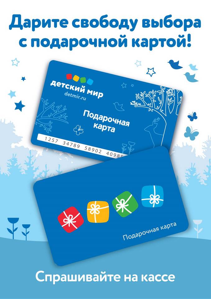Подарочные карты "Детский мир" выпускаются с фиксированным номиналом: 500, 1000, 2000, 3000, 5000 рублей. При проверке баланса отображается первоначальный номинал и текущий остаток средств.